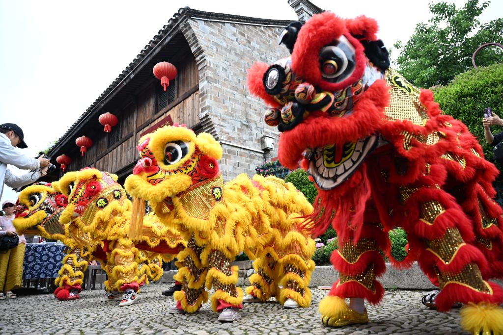 5月19日,在浙江省宁波市宁海县前童古镇,少年舞狮队向游客展示当地特色的舞狮表演。新华社记者刘铭翔 摄