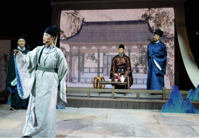 剧目以诗词朗诵为基底,创新融合剧情表演、戏曲吟唱等多元艺术形式,将李白、苏轼、李清照等历史名人的经典诗词娓娓道来。半文半白的语言风格,辅以庭院实景的天然剧场,观众仿佛与文豪们“隔空对话”,感受台州深厚的历史底蕴。