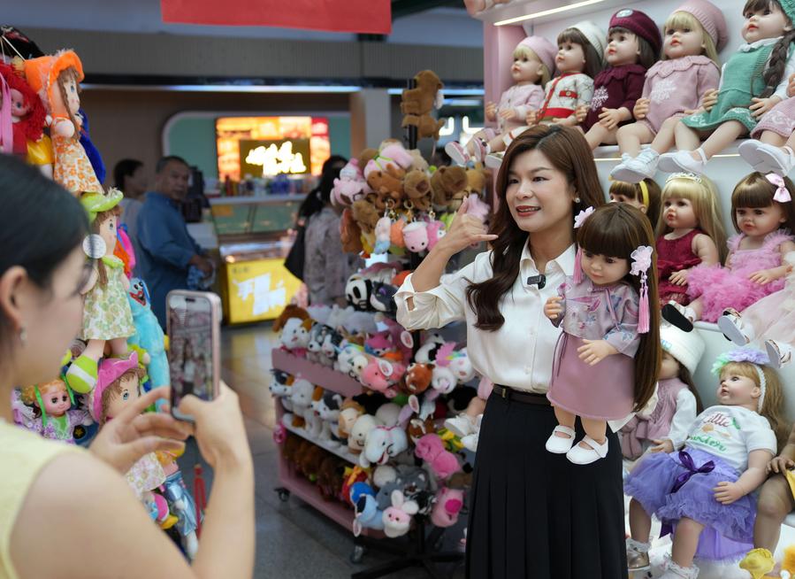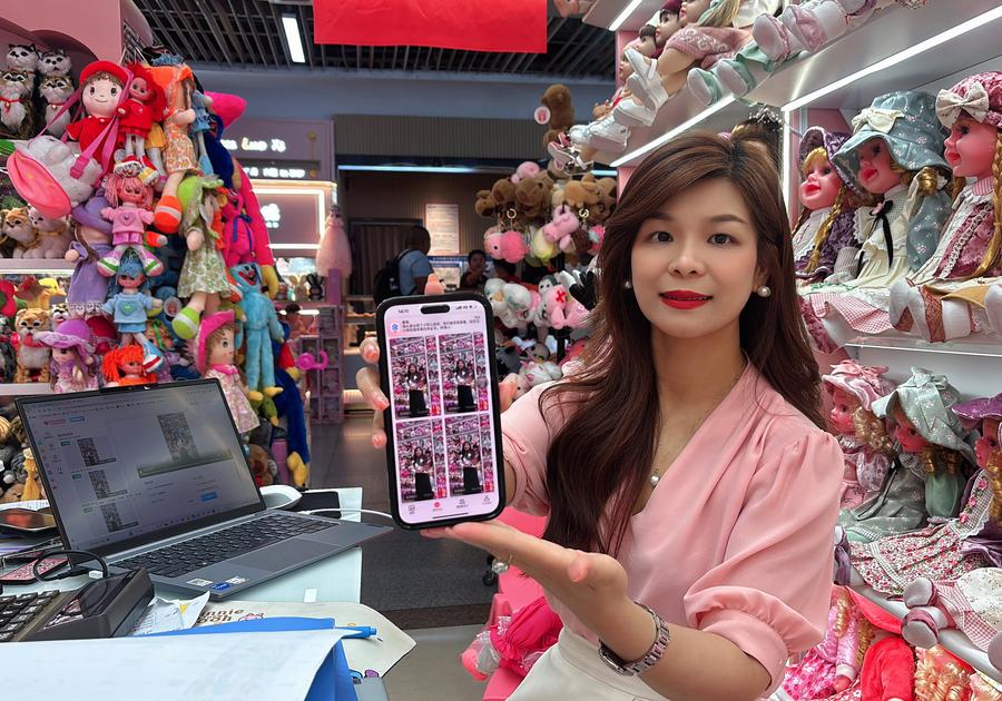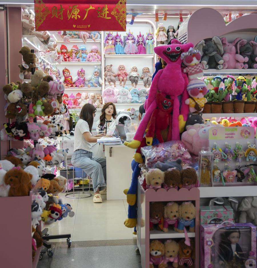 5月20日,孙丽娟在商铺内整理一款玩具样品。新华社记者 韩传号 摄