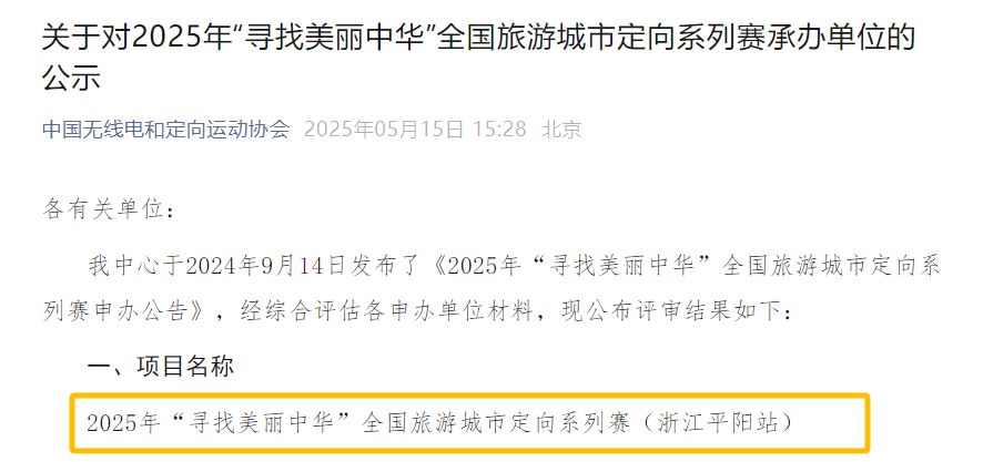 日前,国家体育总局航管中心完成公示,初步确定,今年10月将在浙江省温州市平阳县坡南历史文化街区举办“2025年‘寻找美丽中华’全国旅游城市定向系列赛(浙江平阳站)”。在千年古街中寻找隐藏的目标点,并完成一系列有趣的任务。无论是解锁隐藏的故事,还是挑战自己的导航能力,相信这都将是一次难忘而充满激情的经历。
