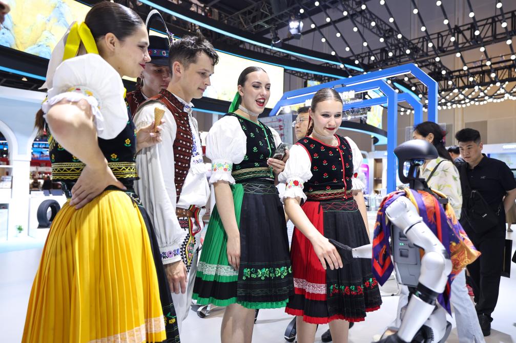 5月22日,外籍参会代表在第四届中国-中东欧国家博览会暨国际消费品博览会现场与人形机器人互动。新华社记者 江汉 摄