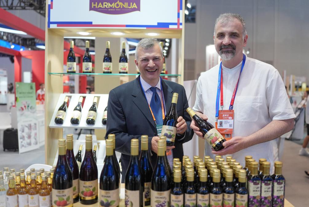 5月22日,塞尔维亚参展商在中东欧展馆推介果酒。新华社记者 黄宗治 摄