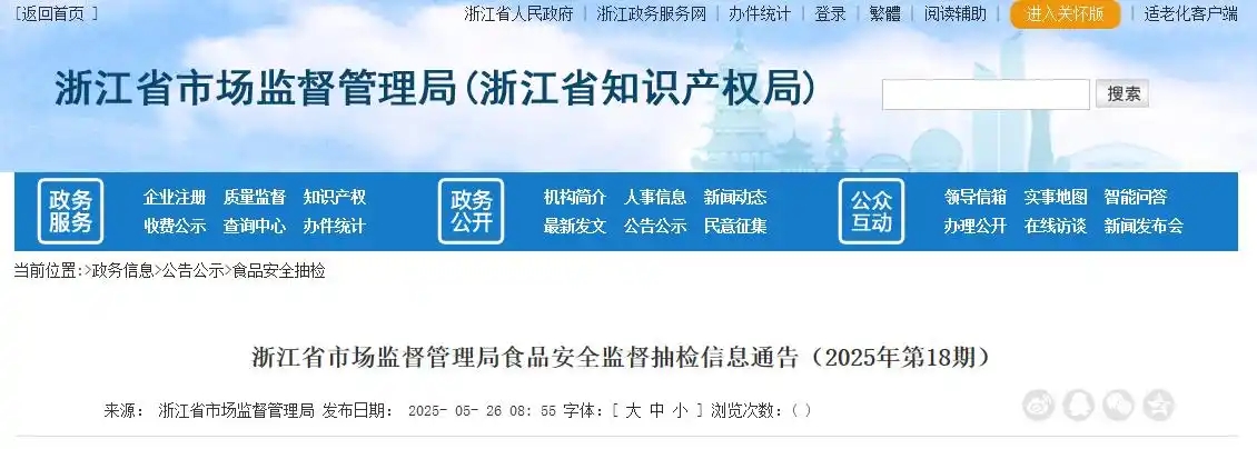 浙江省市场监督管理局食品安全监督抽检信息通告(2025年第18期)