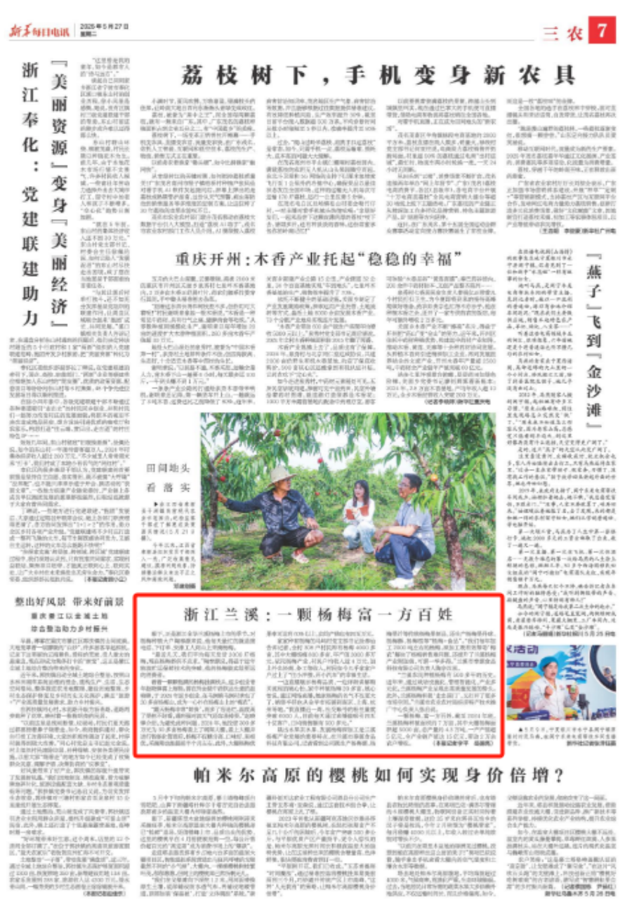 一颗杨梅,富一方百姓。截至2024年底,兰溪杨梅种植面积约7万亩,其中大棚杨梅面积超5000亩,总产量约4.3万吨,一产产值超5亿元,全产业链产值达15亿元,带动2万余农户增收。