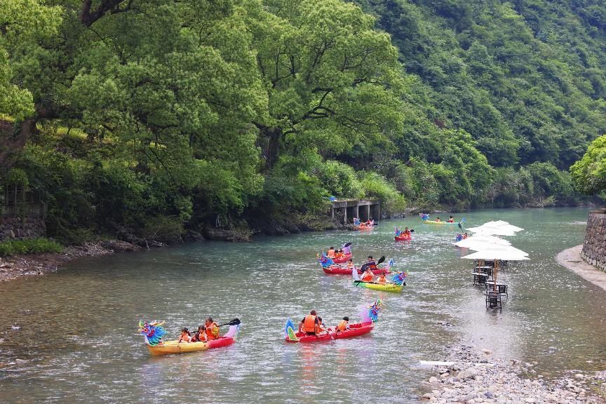 九龙溪里赛龙舟是当地的传统习俗。孩子们在家长的陪伴下,登上象征着左口乡九个行政村的小龙舟,在绿水青山间开始了一场嬉闹和比拼。他们你追我赶,如游龙戏水,劈波斩浪,一时间整条溪上都是欢声笑语。