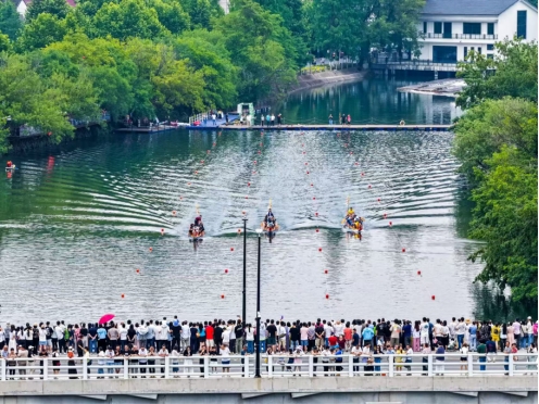作为安吉“十里渔村”文化品牌的核心载体,今年,赋石龙舟赛开设“专业竞技组”与“青年创业组”双赛道。青年创业组的选手由返乡大学生、乡村创客们组成,以龙舟为媒,展现新时代青年扎根乡村、破浪前行的精神风貌。