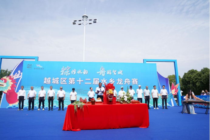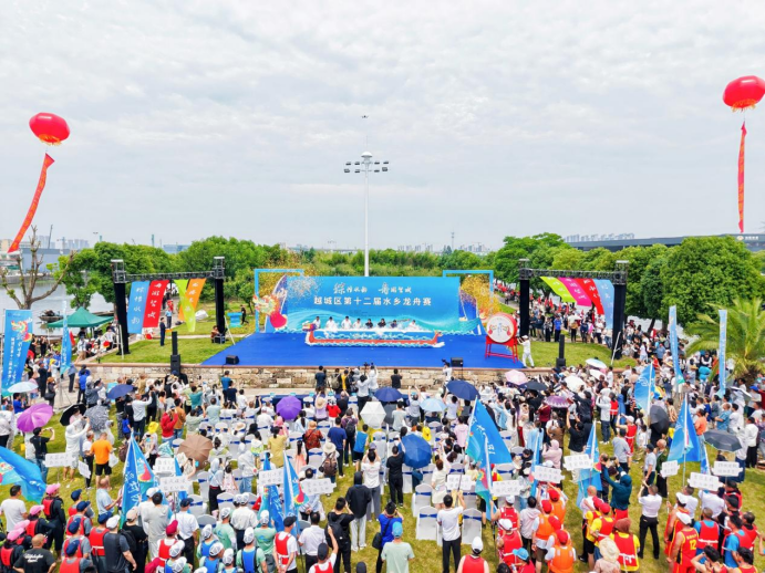 5月31日,以“粽情水韵 舟游智城”为主题的越城区第十二届水乡龙舟赛在绍兴市越城区东湖街道开幕。来自全区各镇街的17支龙舟队伍在800米直道竞速中展开角逐。