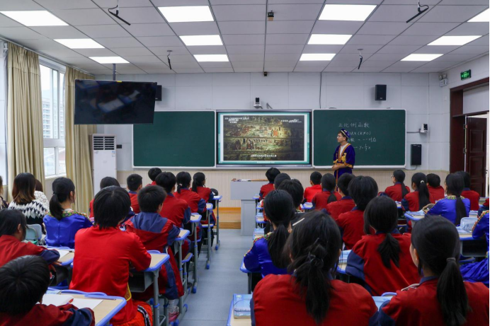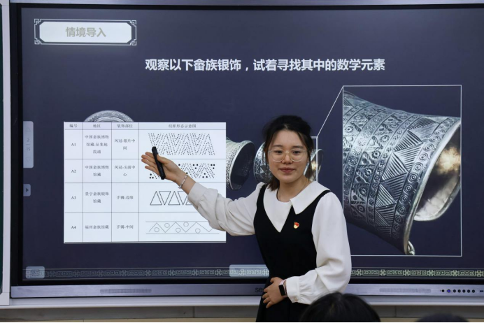 现场同学有感而发:“畲族银饰纹样、维吾尔族的丝绸纹样都是我们生活中的常见事物,这样的课程引入让数学课变得更加有趣了,我在感受对称美的同时,也进一步理解了数学知识,我们应当把这样优美的民族传统文化传承发扬下去。”
