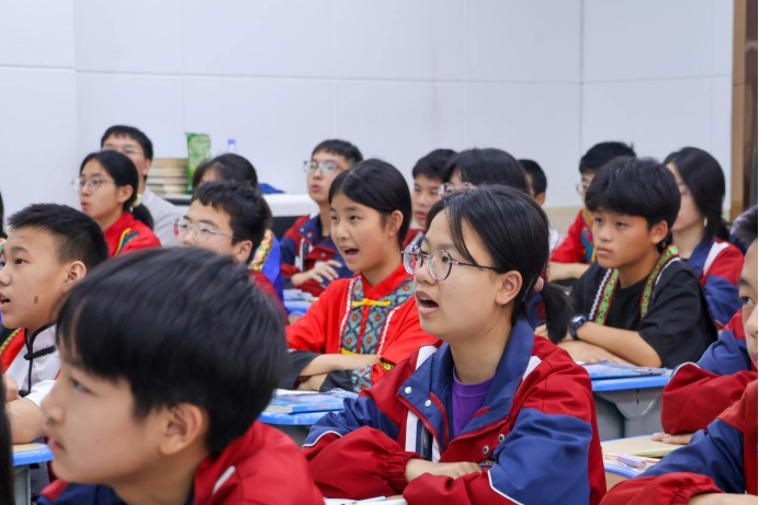 在云峰中心学校,志愿者们带来了融合民族文化与数学知识的精彩课程。来自浙江师范大学教育学院研究生廖蓉蓉,以畲族银饰图案中蕴含的几何线条为切入点,引导学生观察其中的数学元素。“这些线条组成的图案,就像数学中的函数一样,藏着规律和美感。”