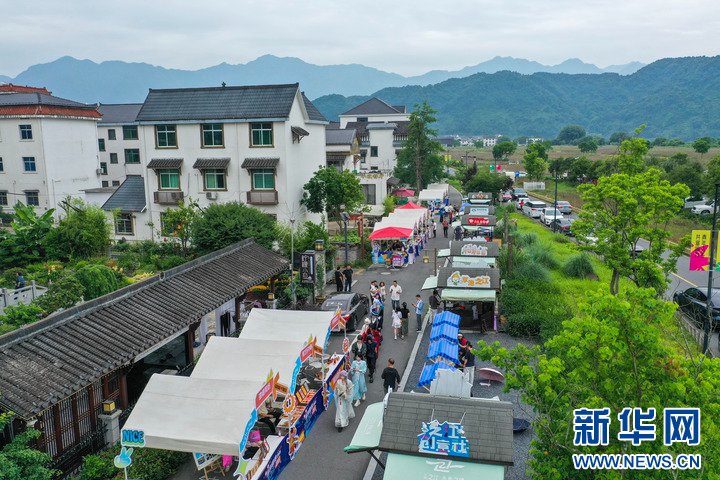这是建德市下涯镇之江村的动漫市集(5月31日摄,无人机照片)。
