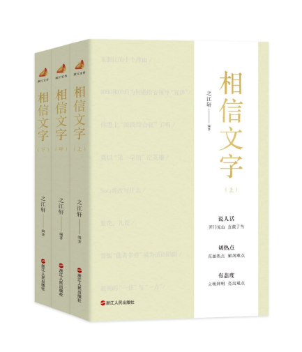 从《笔墨当随时代》《与时代肝胆相照》到《一颗文心济时代》,从《话由心生》《话必关风》到《话与时新》,“浙江宣传”系列丛书已圈住了大批书粉。《相信文字》是该系列丛书的第7部,以上、中、下三册分辑的形式,编选了2024年1至3月“浙江宣传”微信公众号182篇原创文章,内容覆盖多领域、原汁原味,延续了直面热点、解剖难点、亮出观点的文风。