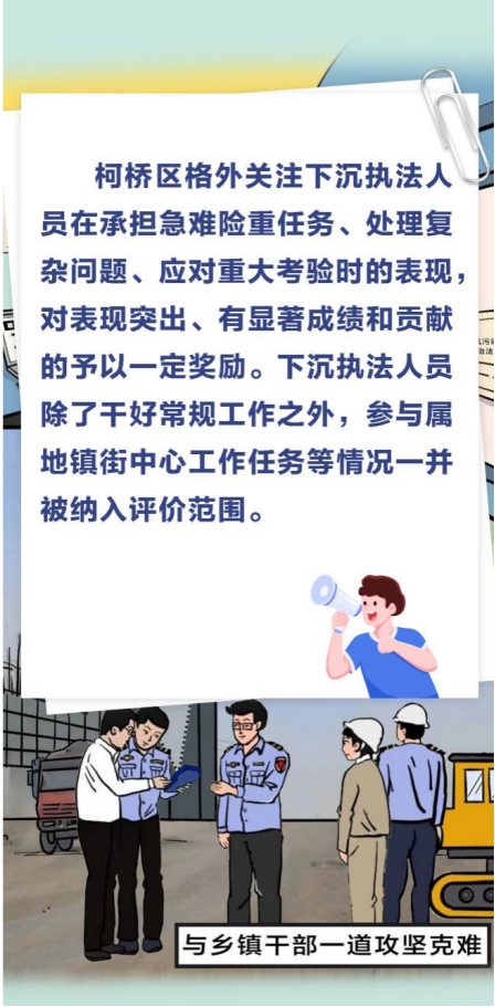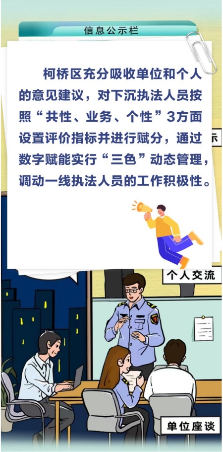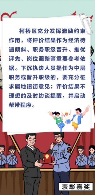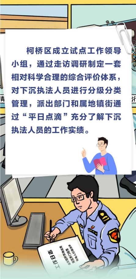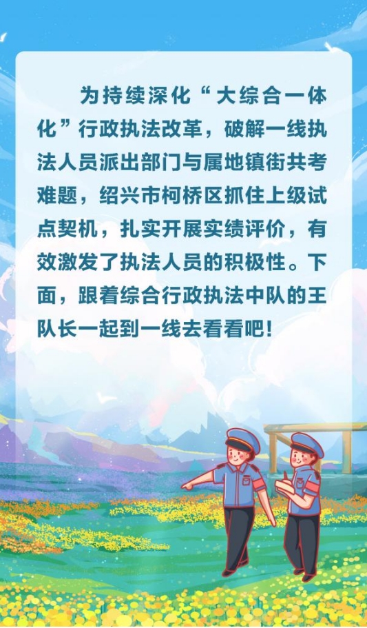为破解一线执法人员派出部门与属地镇街共考难题,浙江省绍兴市柯桥区强化组织领导、制定评价体系、注重实干实绩、加强动态管理、坚持严管厚爱,扎实开展执法人员实绩评价,推动“大综合一体化”行政执法改革持续深化。(倪攀 赵娉/文 绍兴市柯桥区委组织部/供图)