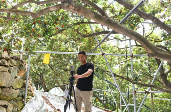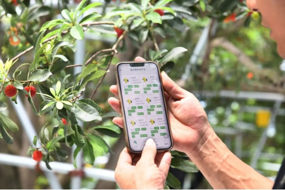 梅农通过手机端的智慧农业平台,可以完成大棚杨梅覆膜掀膜、灌水、施肥等作业。黄静波 摄