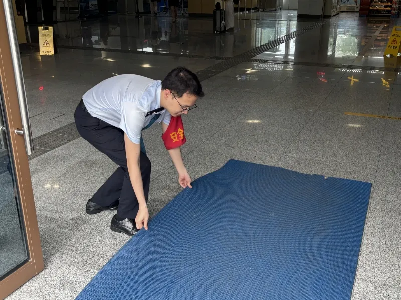 为防止地面湿滑带来的出行隐患,工作人员重点关注运行扶梯和楼梯等区域,及时为携带大件行李或行动不便的乘客提供帮助。此外,温州S1线各车站不仅在出入口、站台处铺设防滑垫、“小心地滑”警示牌,还在车站出入口处配备雨伞机,为乘客湿伞穿“外套”,保障乘客出行安全。