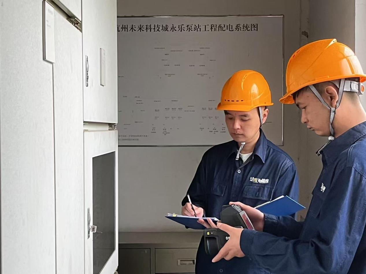 在梅汛季期间,城市排水系统的“心脏”——泵站的安全运行至关重要。浙江大有集团余杭分部“达立电管家”积极组织专业团队,启动了针对泵站安全的专项攻坚行动。巡检人员全副武装,携带红外测温仪、局放检测仪等先进的数字化装备,对辖区内56座泵站及水厂展开了细致入微的“地毯式”巡检排查工作。在巡检过程中,他们对电气设备进行了全方位、无死角地检查,尤其重点监测变压器、开关柜、电缆等关键设备。通过专业仪器,对变压器运行负荷、开关柜触头温度、电缆终端绝缘性能等核心数据进行精准检测,确保每一套设备在梅汛季都能稳定、安全地运行。