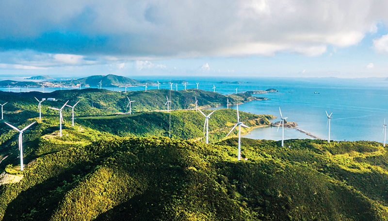 大陈岛山脊上转动的白色风机(资料照片) 车邦国摄