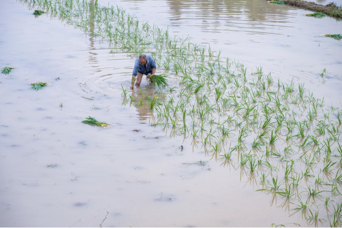 田垄间,种植户们身披雨衣、头戴斗笠,化身雨中的“画师”,踩着湿润的泥土,将嫩绿的秧苗插入田中。