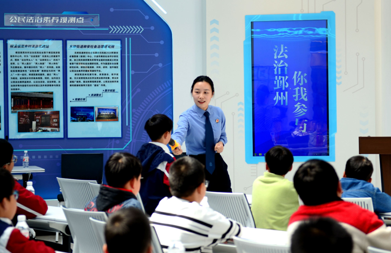 2025年4月2日,在鄞州区新时代法治实践中心,鄞州区检察院开展普法教育活动,图为检察官与学生们互动交流。陈锡江 摄