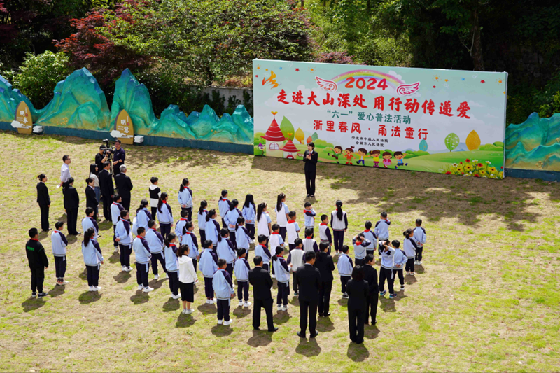 2024年5月29日,宁波市中级人民法院联合余姚市人民法院走进余姚市四明山镇中心小学,开展“浙里春风·甬法童行”六一普法活动。郑珊珊 摄