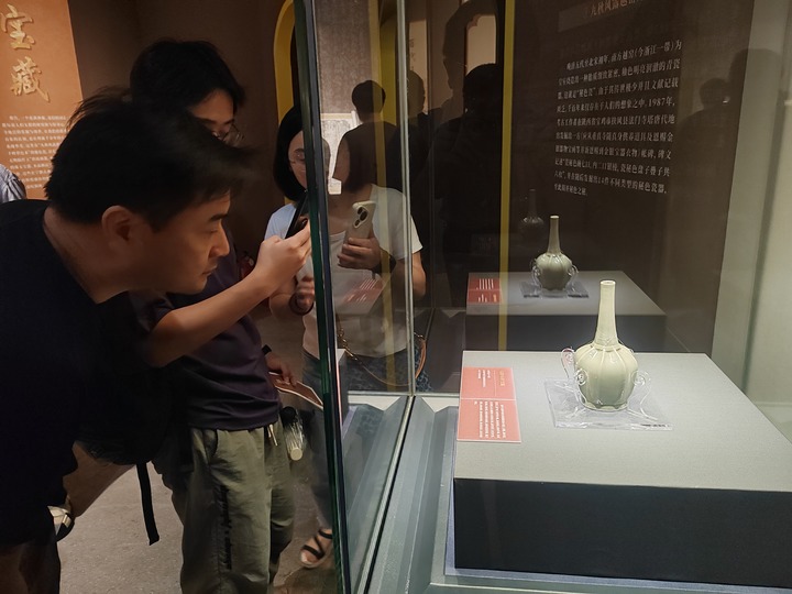 在展厅里,观众就可以看到“八棱净水秘色瓷瓶”和“五瓣葵口大内凹底秘色瓷盘”这两件珍贵的秘色瓷。1987年,它们在法门寺地宫考古中被发现,解答了“何为秘色瓷”这一困扰学界多年的谜题。而浙江省慈溪市上林湖后司岙窑址2015年至2017年的考古发现,与前一发现遥相呼应,解答了“秘色瓷产于何地”的又一谜题。从它们“入宫”,到今朝重返西子湖畔,至少有了1250多年的历史。