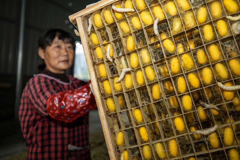 黄金茧色泽金黄,无需染色,抗氧化与抑菌性能优异,适合高端丝绸制品。引入黄金茧后,村民在家门口实现了“人人有事做,家家有收入”的致富梦。“村里几乎家家种桑养蚕,实现户均年增收3万元,村集体年收入也有45万元。”许义凤介绍。