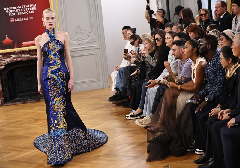 2024年9月27日,在法国巴黎中国文化中心,模特在“高情远韵”——中国高级定制婚嫁礼服品牌六礼的发布会上展示服装。新华社记者 高静 摄