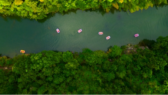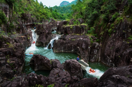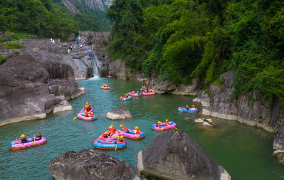 据介绍,美人峰漂流项目依托天然峡谷地貌设计,全程3公里穿越13道奇幻关卡,1.5至2小时的漂流体验让游客尽享速度与激情的碰撞。而在刺激之余,游客还可欣赏沿途风光,既有怪石林立的奇峰,也有郁郁葱葱的森林,楠溪江的诗画美景尽收眼底。