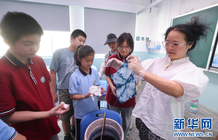 7月1日,诸暨市民族团结进步促进会的志愿者在东和乡中心学校教孩子们学习手工扎染。