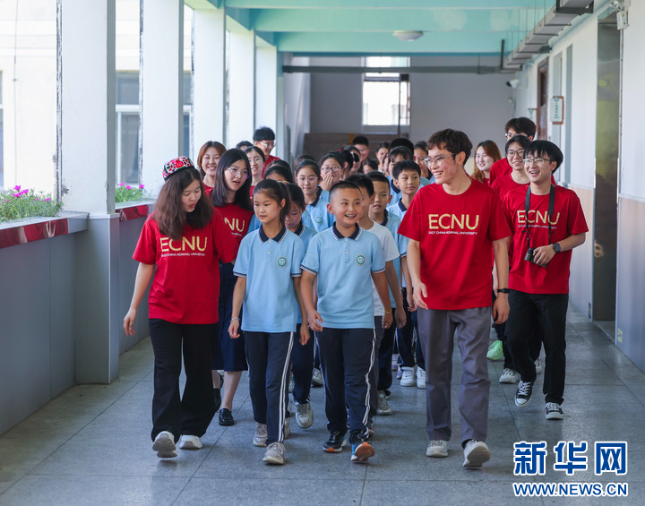 7月1日,华东师范大学的大学生志愿者带着东和乡中心学校的孩子去上课。