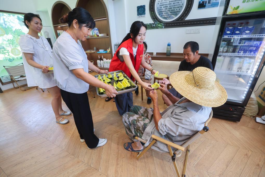 7月3日,在湖州市长兴县虹星桥镇郑家村公路服务驿站内,志愿者给前来休息的户外工作人员提供凉茶、水果。新华社记者 徐昱 摄