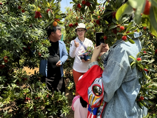 直播不仅带动了杨梅的电商销售,也带动了农旅融合。当镜头对准基地里采摘工人忙碌的身影和挂满枝头的紫黑果实时,弹幕中“上链接”“想采摘”的呼声不断刷屏。通过文成县助农直播共富小分队队长刘万金的直播,还吸引了俄罗斯友人耶莲娜前来体验杨梅采摘。