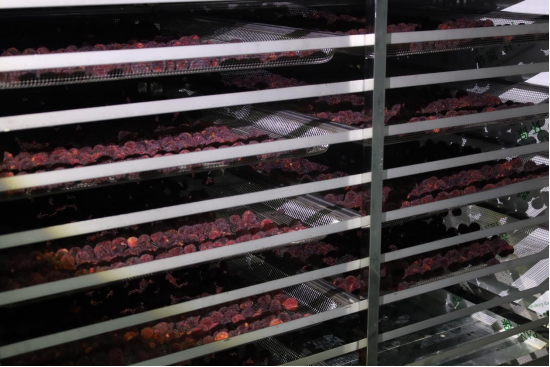 为了让杨梅摆脱了夏季“限定版”的标签,文成县一直在不断探索深加工。近日,南田镇的禾悦共富工坊内正进行着一场“甜蜜试验”,一颗颗杨梅被整齐的铺在烘干盘上,等到30个小时后,烘干的杨梅便可出炉。