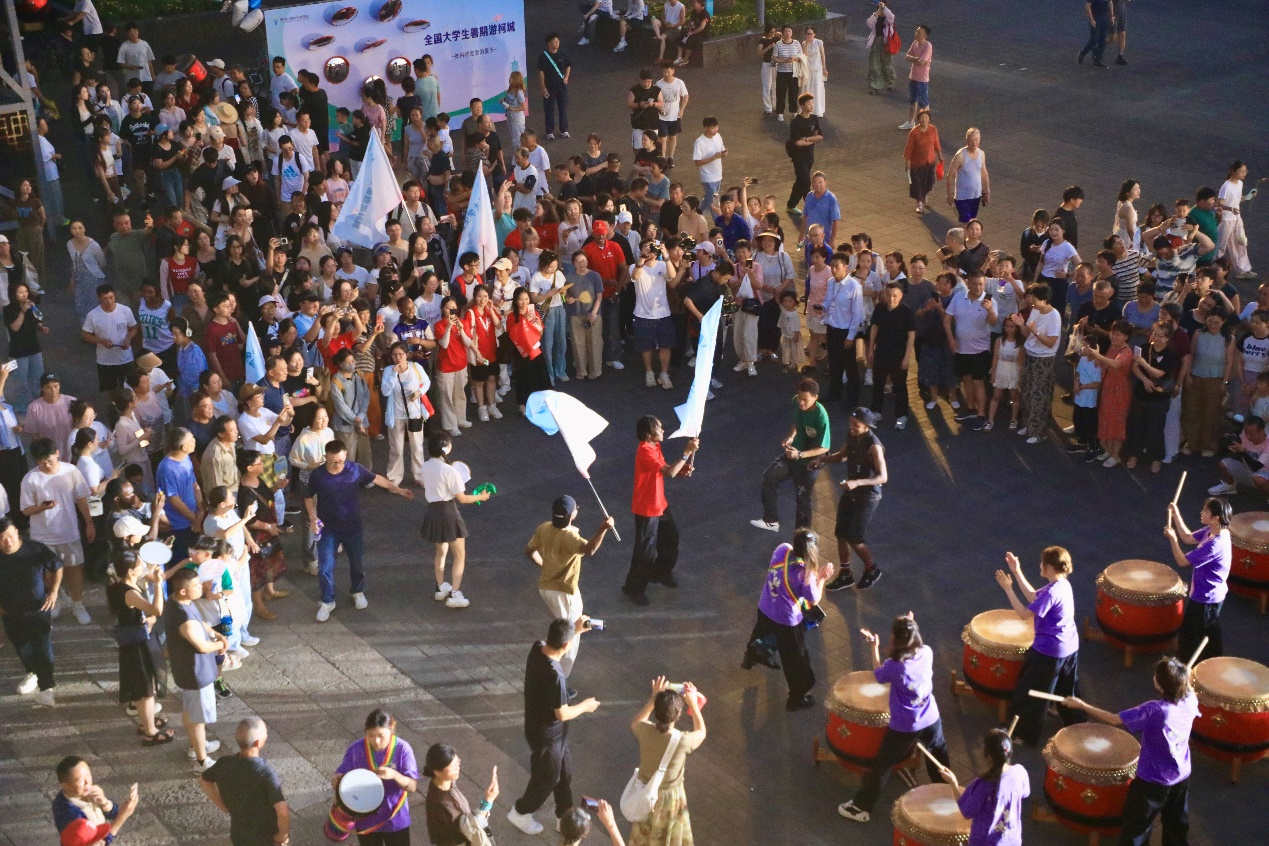 鼓点铿锵,青春飞扬。伴随着立春鼓社气势恢宏的鼓乐,来自北京大学、浙江大学、华中科技大学等40余所全国各地高校的200余名大学生,随韵律节拍而击掌、舞动,蓬勃的青春气息瞬间点燃全场,吸引了不少市民游客驻足喝彩。