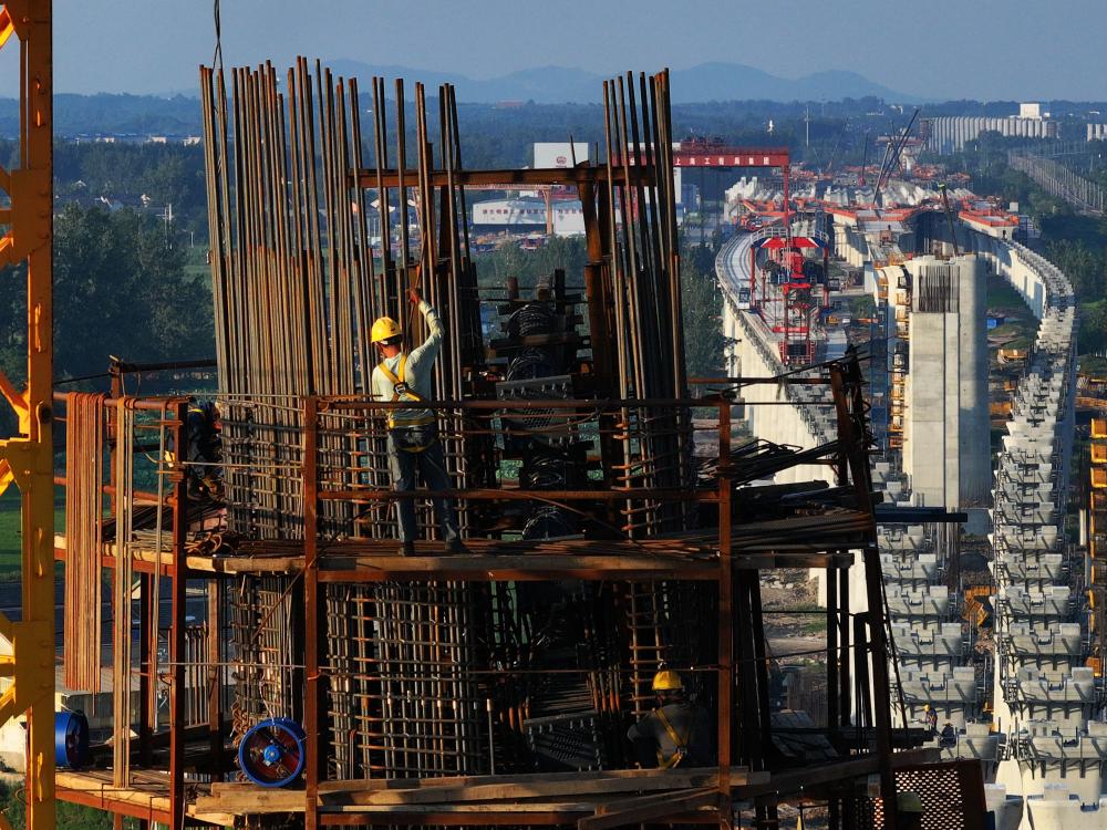 7月3日,中铁上海工程局的工人在宁淮城际铁路(南京至淮安)5标项目跨滁河斜拉桥施工作业(无人机照片)。(新华社记者 李博 摄)
