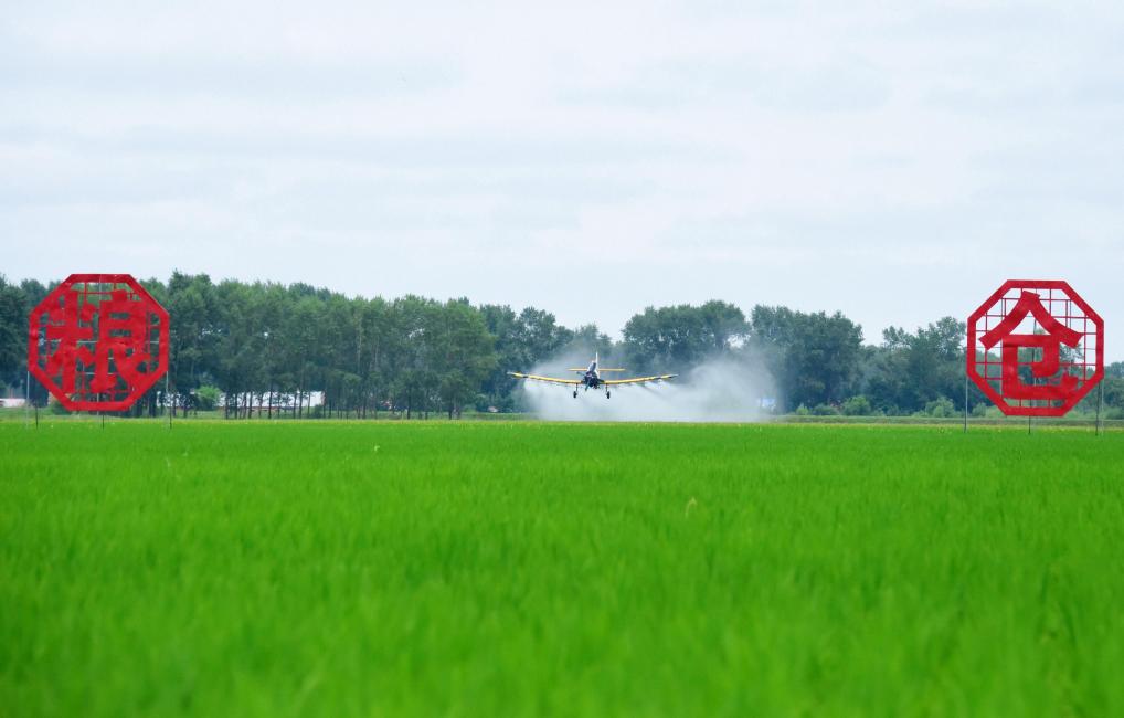 7月1日,在北大荒集团黑龙江绥滨农场有限公司龙泉管理区,一架农用飞机进行航化作业(无人机照片)。新华社发(李兴摄)