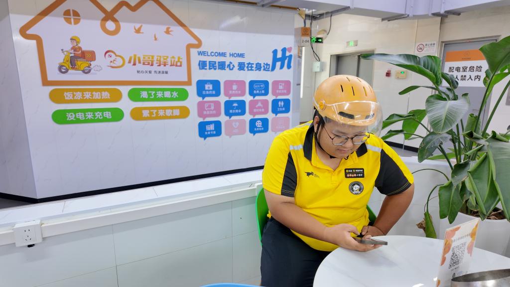7月7日,在杭州新天地农贸市场无堂食外卖聚集区内的小哥驿站,一名外卖骑手正在休息。新华社记者张璇 摄