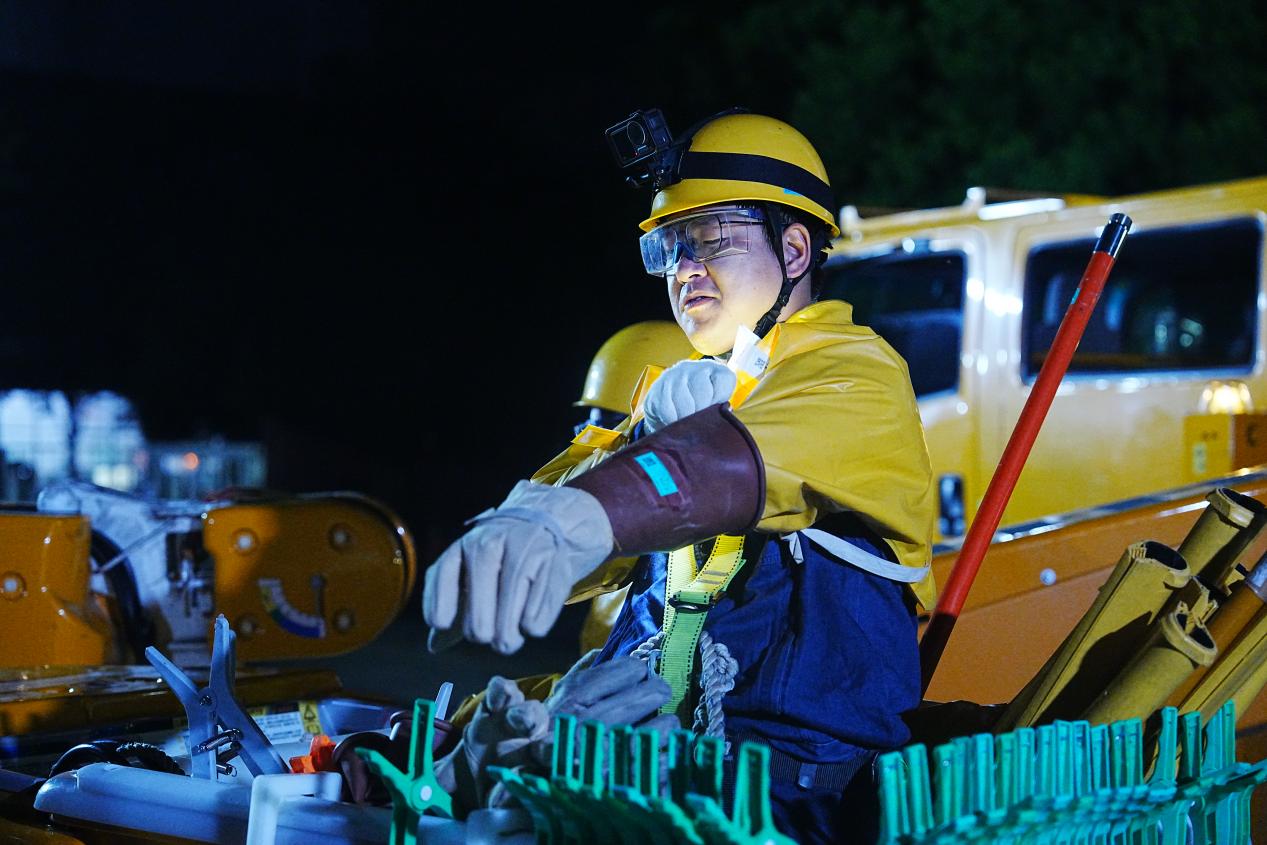 照明灯布置到位,现场顿时忙碌起来,工具摆放得整整齐齐,安全围栏也妥善设置。工作人员各司其职,一切准备就绪。凌晨1点,工作负责人再次发出指令,作业人员章郑凯、俞正阳迅速行动起来。他们系紧安全带,套上厚重的绝缘披肩、手套和靴子。绝缘斗臂车缓缓升起,将两人平稳地送至10米高空。在照明车投射的灯光下,两人配合默契,由近至远、由低到高地展开绝缘遮蔽工作。