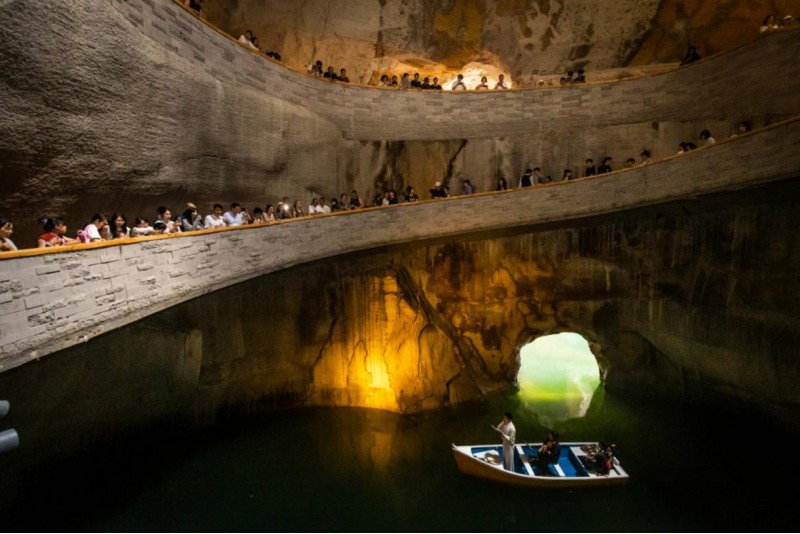 一场快闪音乐会,就此拉开帷幕。在一个半小时的时间里,歌剧、小提琴演奏、舞蹈、合唱等15个节目,依次上演。石窟里的剧场、连廊、深潭等空间,变成了表演舞台。在表演者的指引下,观众移步换景,开始了一场沉浸式的艺术体验之旅。