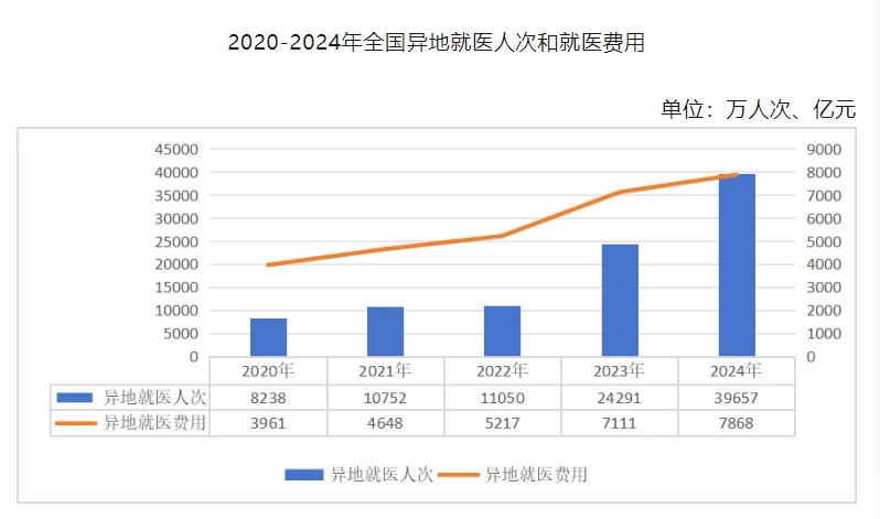 数据显示,2020年至2024年间,全国异地就医人次和就医费用呈增长态势。(赵方园)