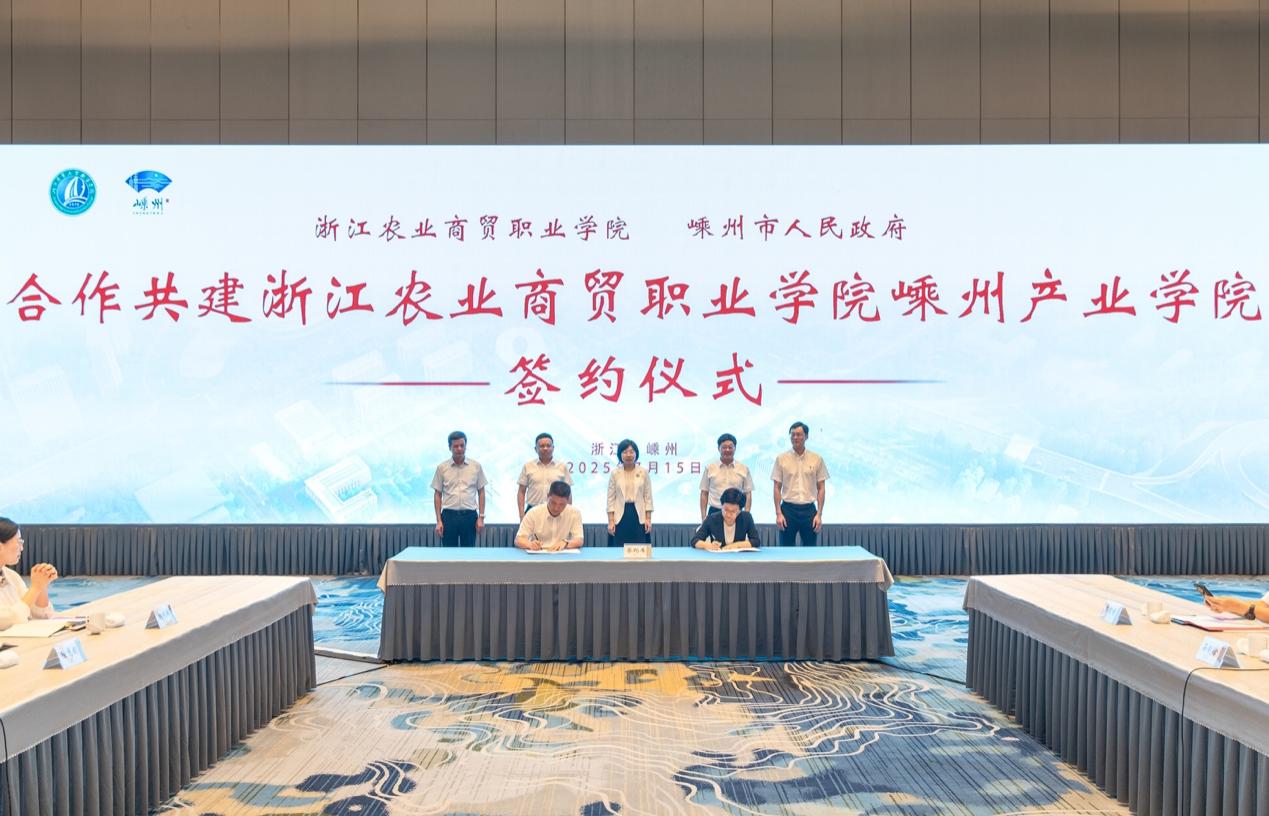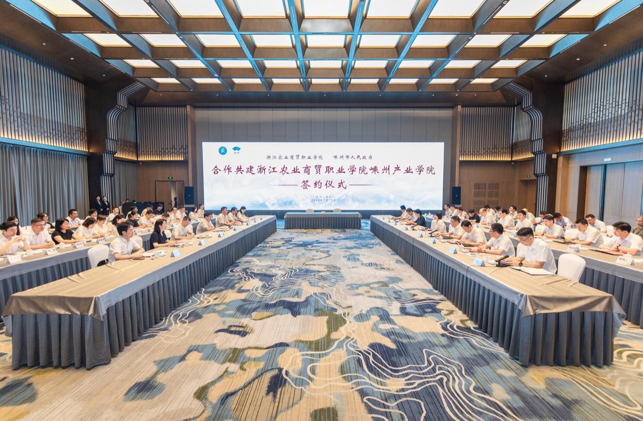 7月15日,浙江农业商贸职业学院与浙江绍兴嵊州市人民政府举行签约仪式,合作共建嵊州产业学院(嵊州小吃学院)。此次合作是学校深化产教融合、服务地方发展的重要里程碑,标志着校地协同发展步入全新阶段。