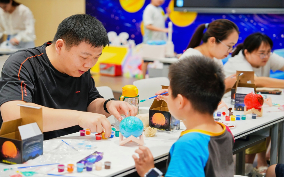 当星空幕布之下,《星际穿越》的配乐响起,图书馆一楼梦幻的“太空舱入口”瞬间将大家拉入浩瀚宇宙;行星拼图环节,孩子们秒变小小天文学家,连成完整太阳系的一瞬间,那是和宇宙的奇妙对话;在银河探索课堂上,老师与孩子们共读《飞向太空》;家长与孩子携手制作星球灯,用创意和爱点亮属于自己的“小宇宙”……