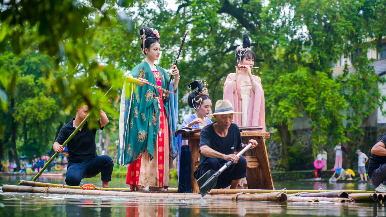 本次活动的亮点在于彻底打破了“台上演、台下看”的固化模式,以“文化+旅游+民生”为融合支点,将整个中村的山水林田路桥变为流动舞台,一步一景皆是文化演出。民乐团在溪畔开启市集序章,再往前走,能听见姚剧、越剧的悠扬唱腔在古村落中婉转流淌,看见竹筏载着民乐演奏者顺溪而下,视觉听觉得到双重享受;远处,身着旗袍的表演者优雅穿梭于白云桥与河道之间,古今辉映,和谐共生;白云桥下也搭起“落日舞台”,乐队歌声融入暮色,别有风味。“今天本来只是想来中村采风,没想到碰到了新颖的‘文化输出’模式,边走边看很过瘾。”游客陈雨晴笑着说。