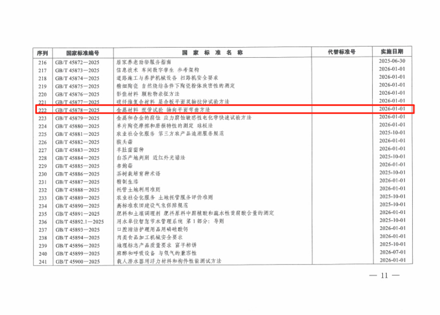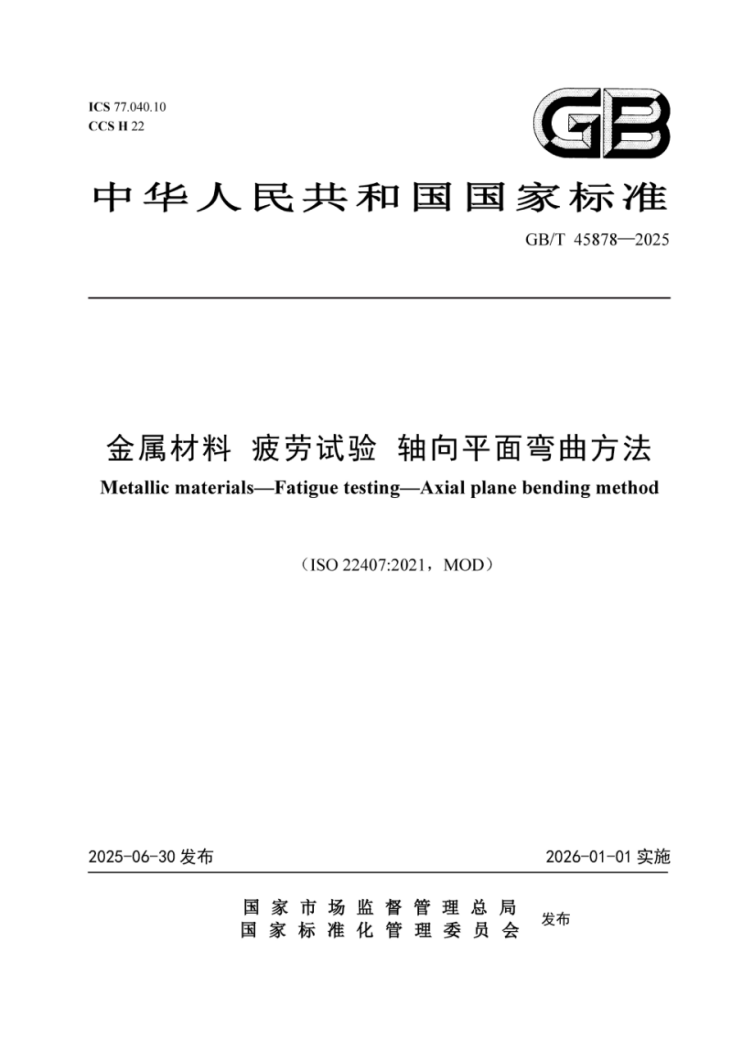 近日,由浙江省特种设备科学研究院牵头起草的国家标准《金属材料 疲劳试验 轴向平面弯曲方法》(标准编号GB/T 45878-2025)发布。