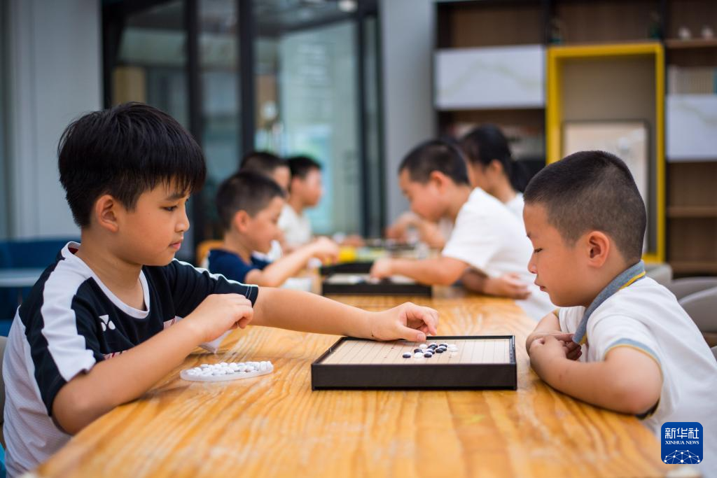 7月21日,小朋友在杭州市上城区望江街道党群服务中心下棋。