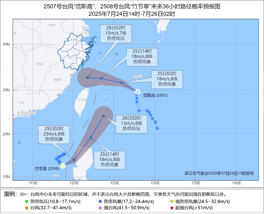 今年第7号台风“范斯高”7月24日17时位于距离浙闽交界东偏南方向约770公里的海面上,强度等级为热带风暴,预计将以每小时25公里左右的速度向西偏北方向移动,于今天夜里移入东海南部海面,并向浙江南部到福建北部一带沿海靠近。