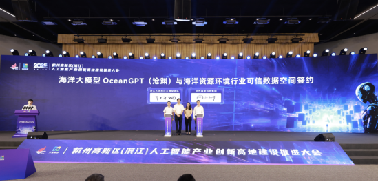 大会还发布了人工智能典型场景需求,包括人工智能+生产制造、金融贸易、医疗健康、民生服务、社会治理等五大领域,加快场景驱动,促进人工智能与经济社会发展深度融合。同时举行了人工智能项目签约仪式,涵盖商业航天、AI感控、数据安全、低空防御、数据标注、具身智能云服务及通用3D大模型研发等前沿领域。浙江大学陈华钧教授与高新科创集团签约,“海洋大模型OceanGPT(沧渊)”与“海洋可信数据空间”项目达成合作。