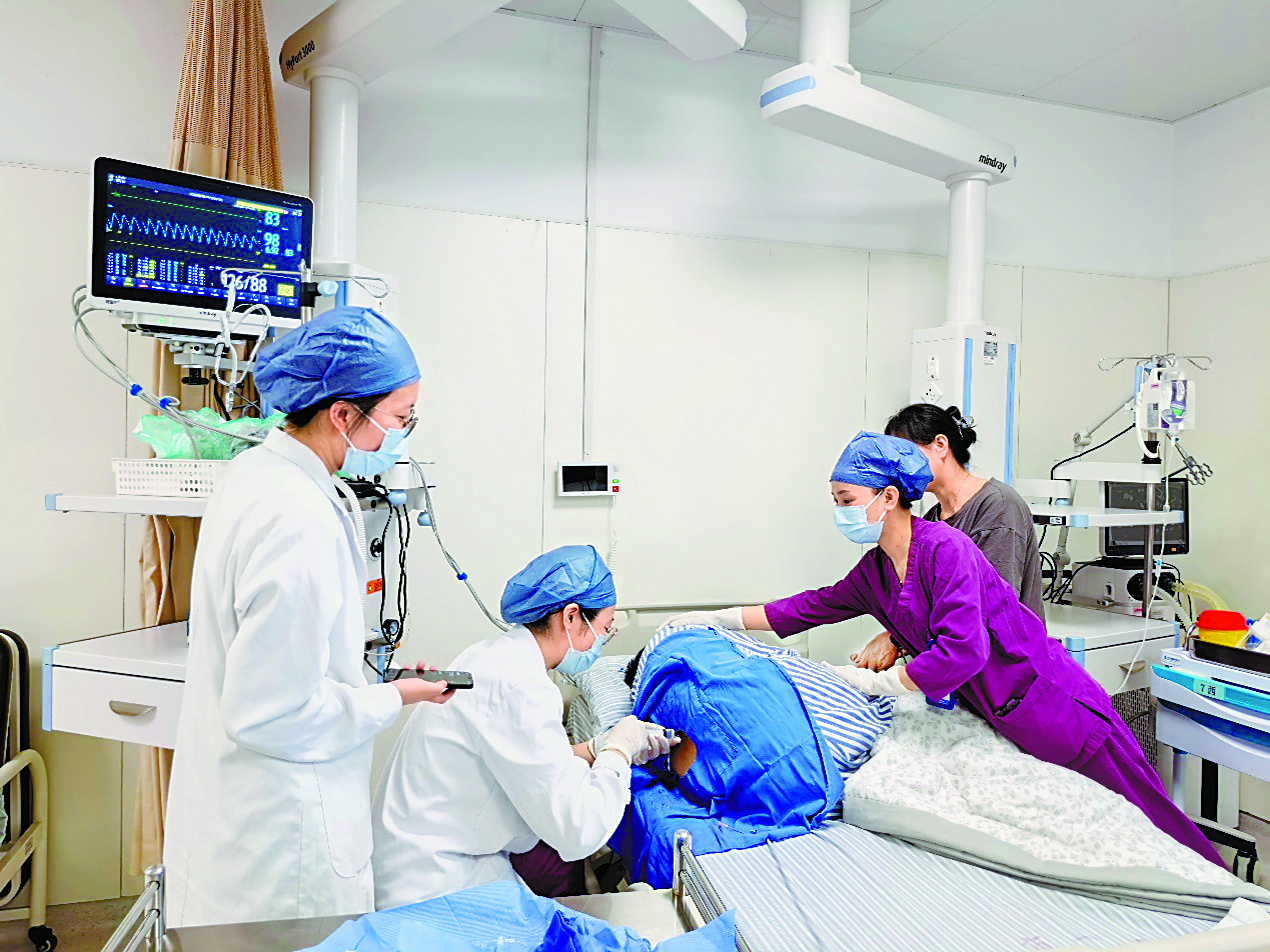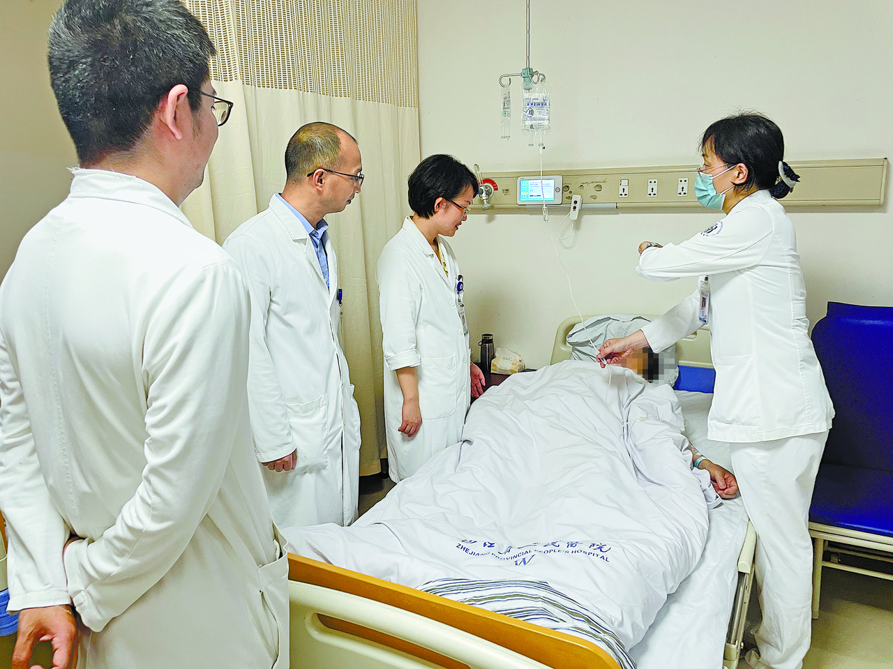 廖峥娈(左三)在病房观察患者注射仑卡奈单抗的情况。 受访者供图