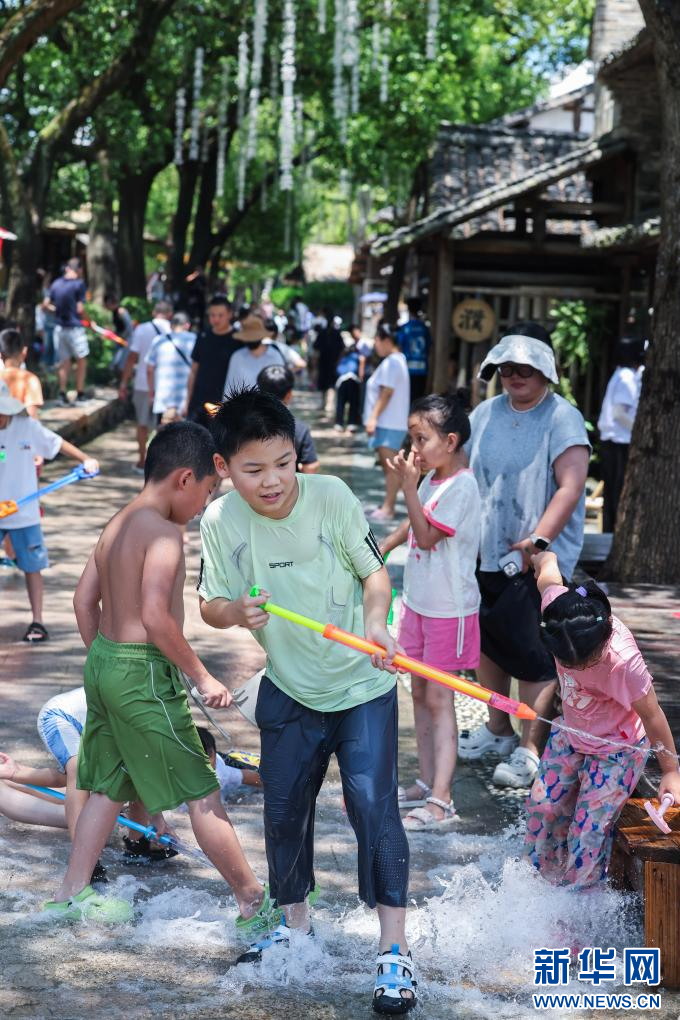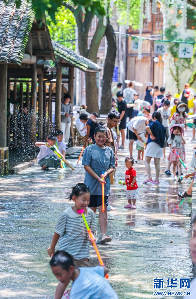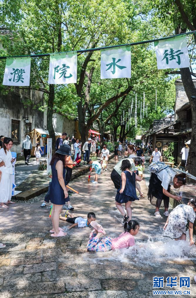 8月8日,在桐乡市濮院时尚古镇的水街上,孩子们在清水流淌的石板路上嬉水,感受夏日清凉。