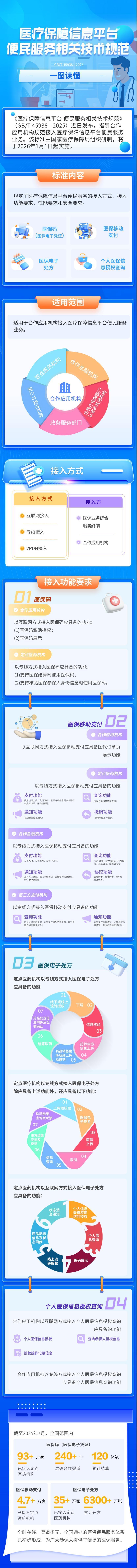 截至今年7月,全国接入医保码(医保电子凭证)的定点医药机构超过93万家、接入展码合作渠道的240余个,累计结算120亿笔;接入医保移动支付的机构达4.7万家;接入医保电子处方的机构超过35万家,累计开方6300余万张。