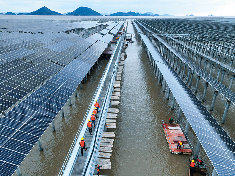 在浙江省台州市三门县,工作人员经过通道去滩涂上安装光伏板(2024 年 3 月 26 日摄)翁忻旸摄 / 本刊